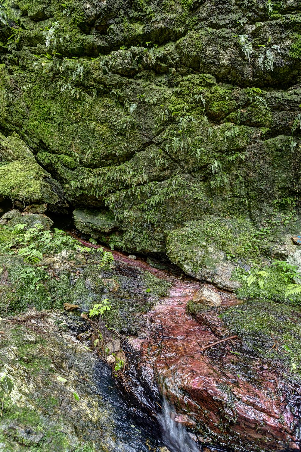 「苔で岩が赤くなっちゅう。ここはいつも同じ水温、同じ水量で、夏でもずっと水に手を入れてると冷たいくらいやきっ。美味しいから飲んでみて」