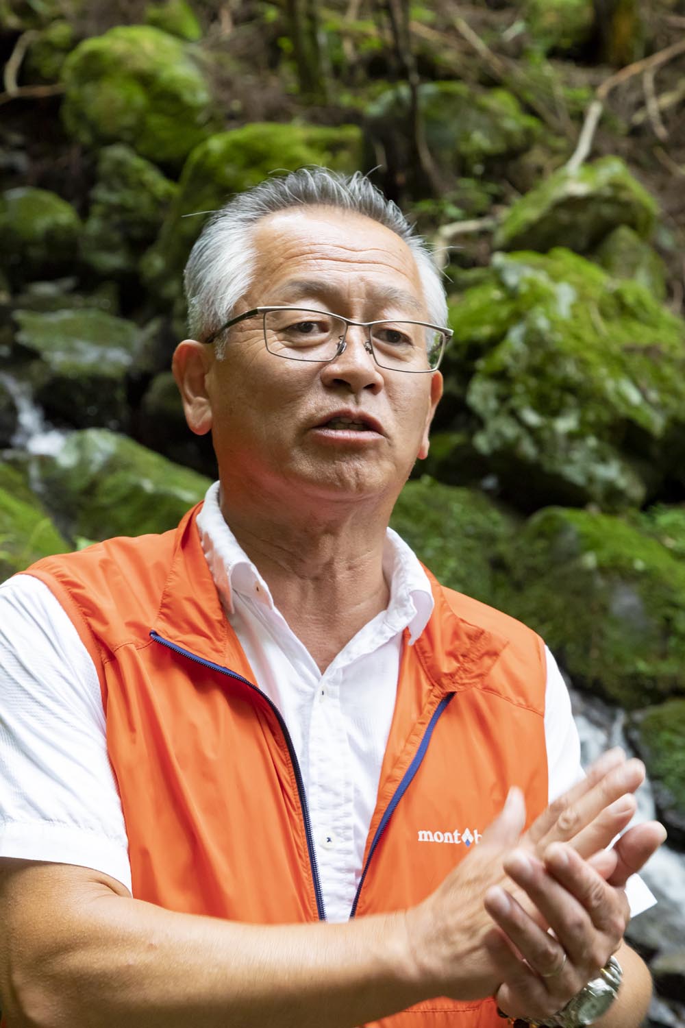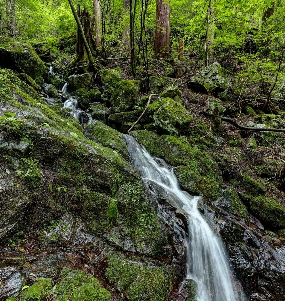 谷脇さんがそう教えてくれた源流点の水は、湧き水と表面水が渾然一体となり、苔むした岩を滝のように滑り降りてくる。今この瞬間に山から水が生まれ出ているかのような光景に、水が山の恵みであることを実感する。