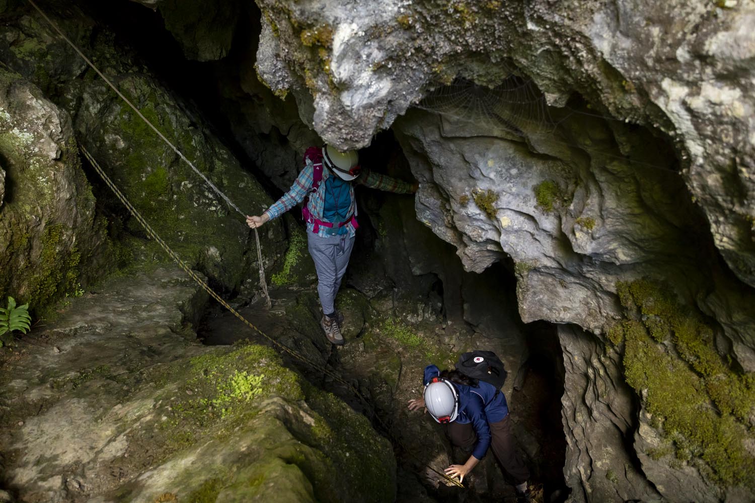 四万十川の源流にある鍾乳洞、稲葉洞。入口の縦穴をロープにつかまって降りて行く。