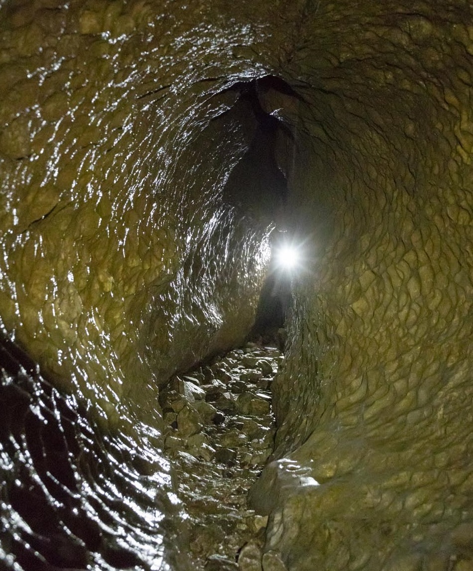 稲葉洞の内部。ヘッドランプで照らすと、細かく波打った岩肌が浮かび上がった。