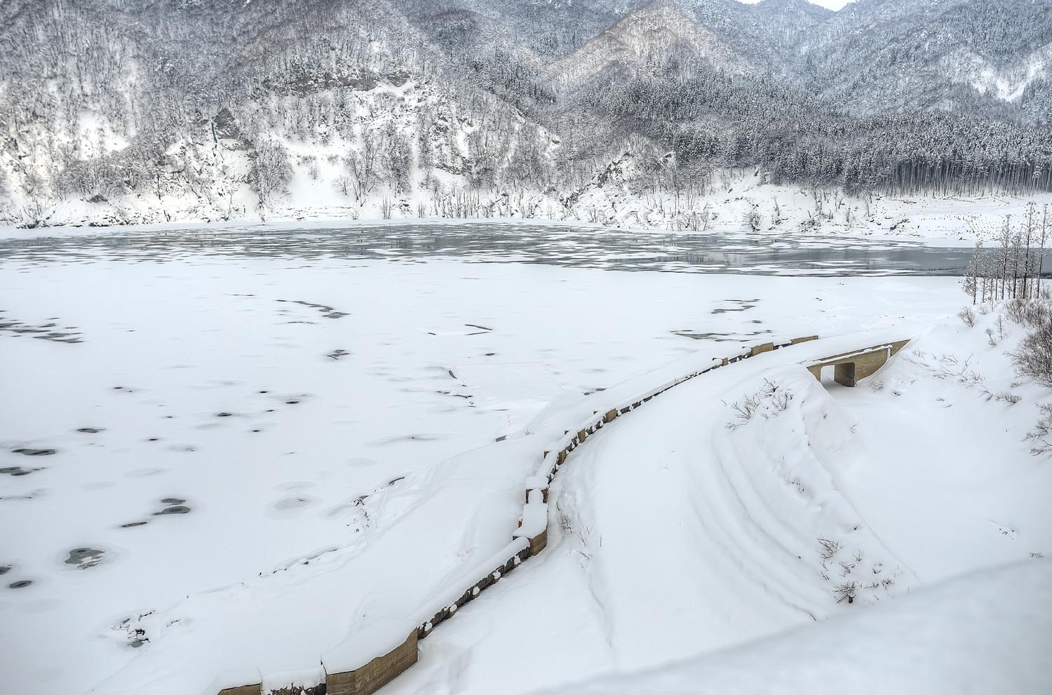 村の中心部に戻る途中、砂子瀬橋の上からダム湖の津軽白神湖を見た。この地域では、昭和35年(1960年)に目屋ダムが造られ、さらに平成28年(2016年)には目屋ダムの下流に津軽ダムが完成した。雪に覆われたダム湖の真ん中あたりを工藤さんが指差す。