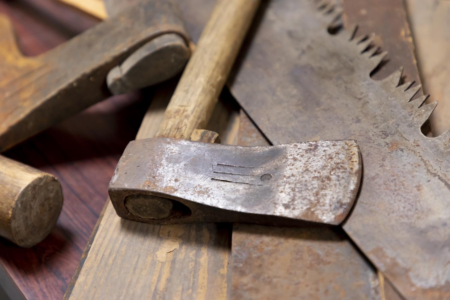 この地域で使われていたヨキ(斧)。刃の3本線は山の神に捧げる御神酒を裏面の4本線は「地・水・火・風」を表している。