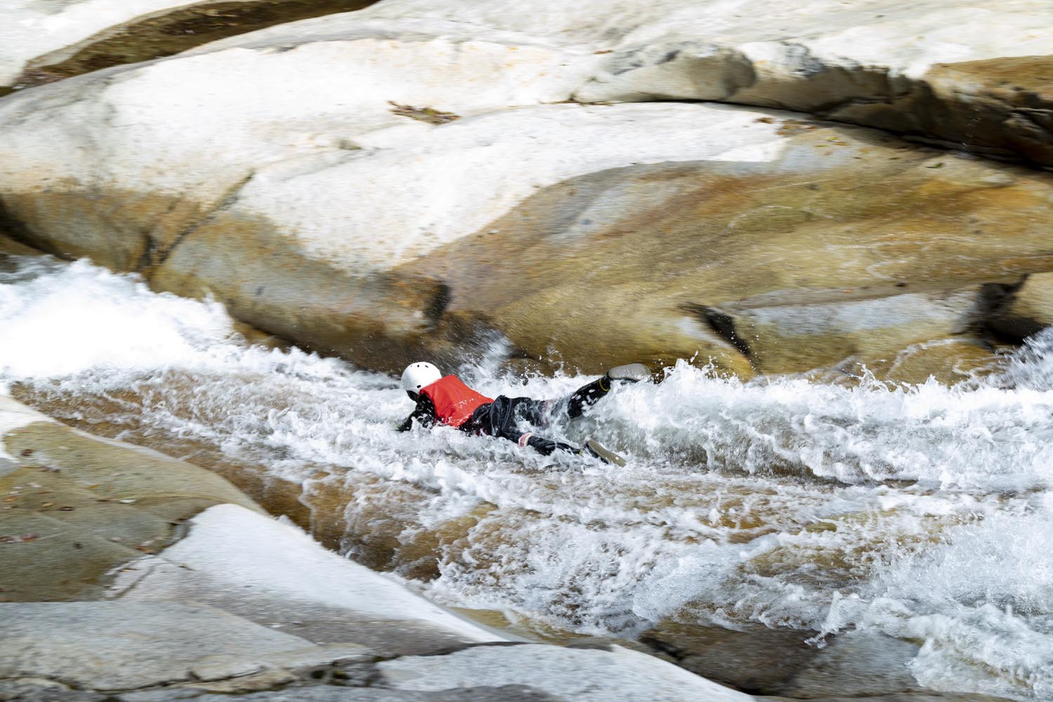 花崗岩の巨大な一枚岩の傍らに、ゴロゴロ転がっている巨大な岩。その間を澄みきった水が走るように滑っていく。 その流れに、ゆっくりと足を踏み入れる。「あれっ、そんなに冷たくないな?」と思った瞬間、フォレストキャニオンのリバーガイド・石川雄一さんに勢いよく水をかけられた。こちらも負けずに水をかけ返す。はしゃいでいる間に、ウエットスーツの中にゆっくり入ってきた水は、やっぱりそれほど冷たくない。