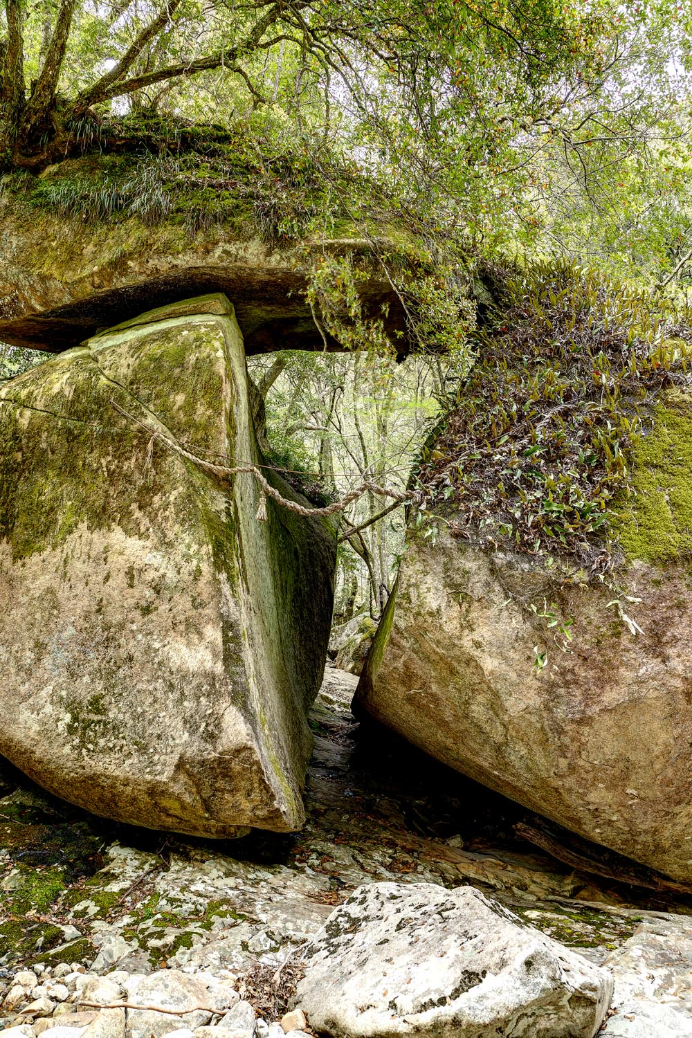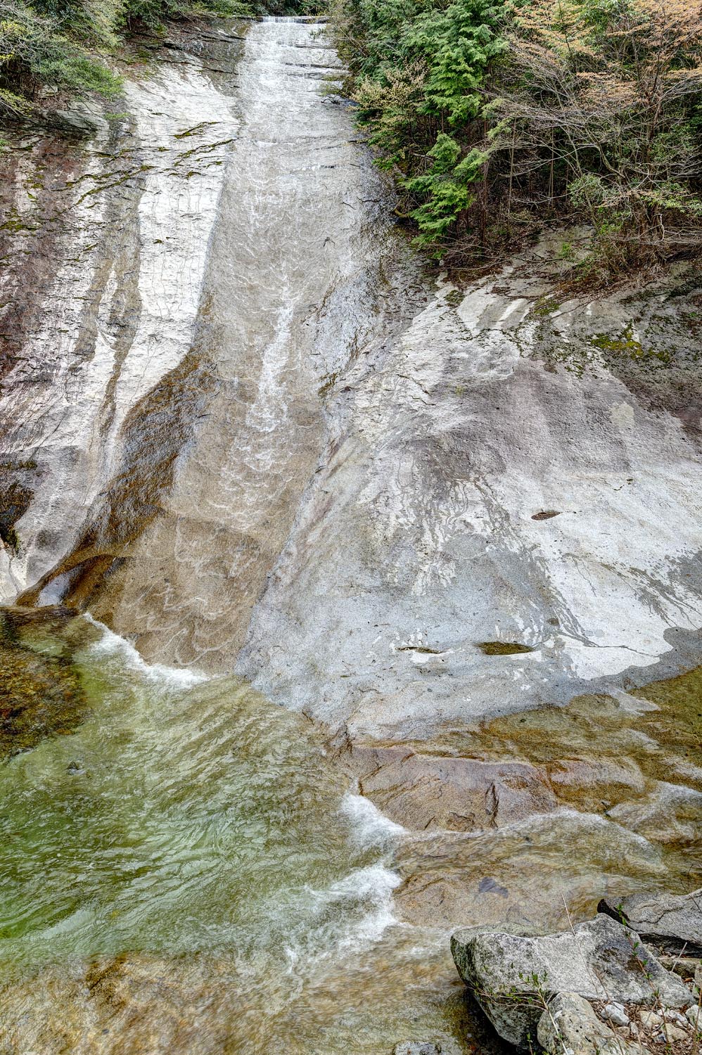 花崗岩が侵食されてできた滑床渓谷には大きな岩が多い。鳥居岩は三つに割れて鳥居の形になったことからそう呼ばれている。