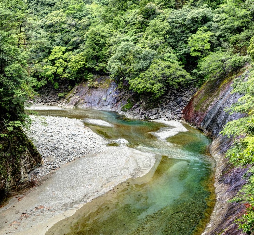 大杉谷の登山道の入口から見下ろした宮川。切り込んだ峡谷を流れるエメラルドの水はどこまでも美しい。
