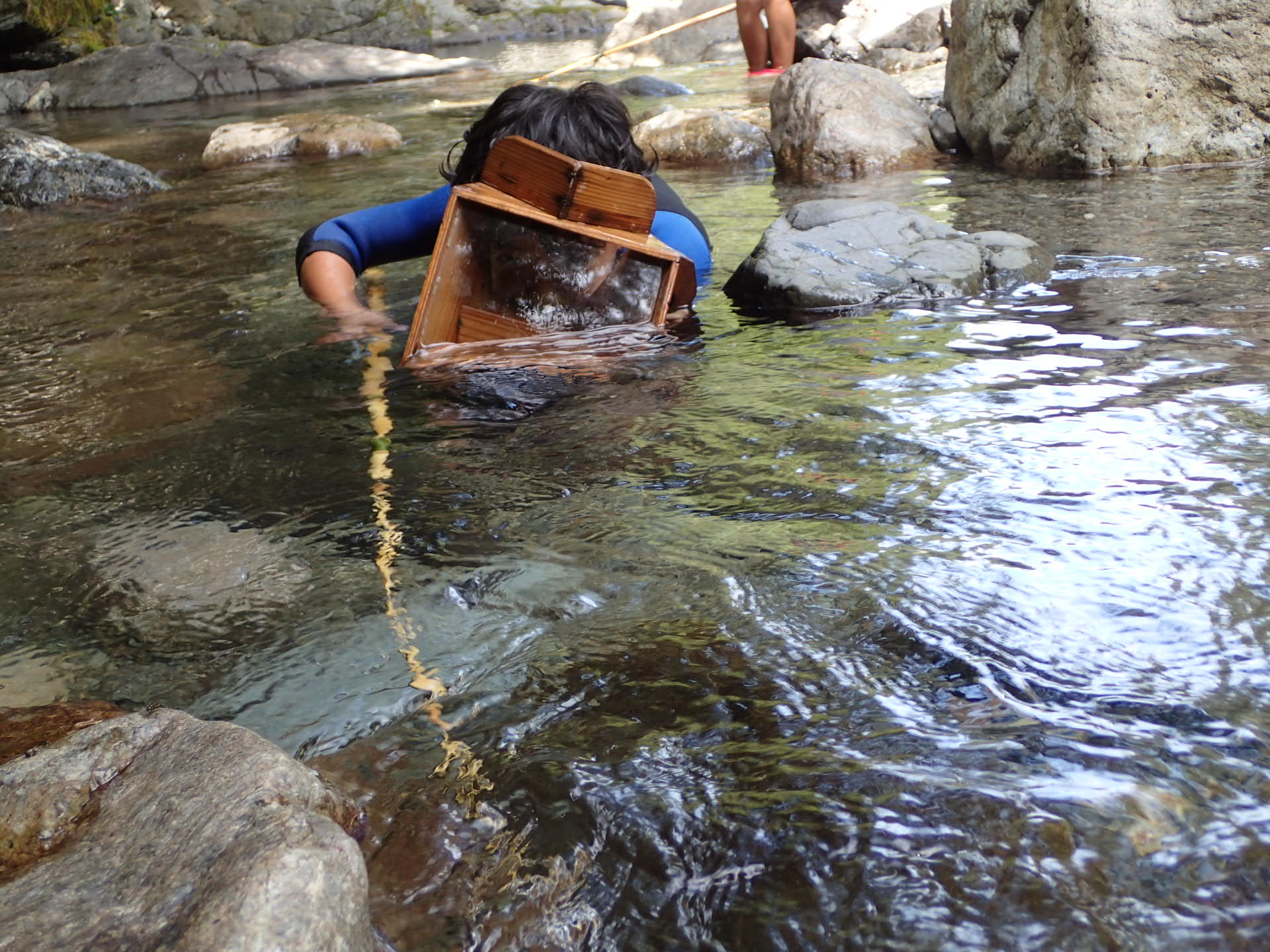 『しゃくり』とは、水眼(スイガン)という木で作った箱メガネと、一本針をつけた竹竿を使って魚を引っかけて獲る漁法。実物を見せながら、大西さんが「水眼の特徴、わかりますか?」と、尋ねられる。