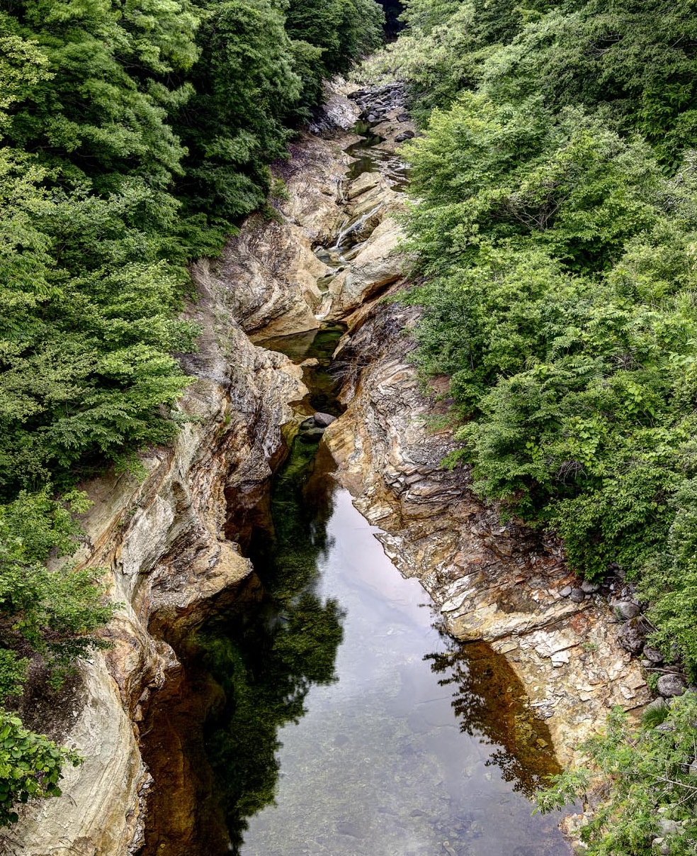 横川にかかる「やまびこ吊り橋」からの眺め。晴れていれば不忘山(ふぼうさん)が見える。