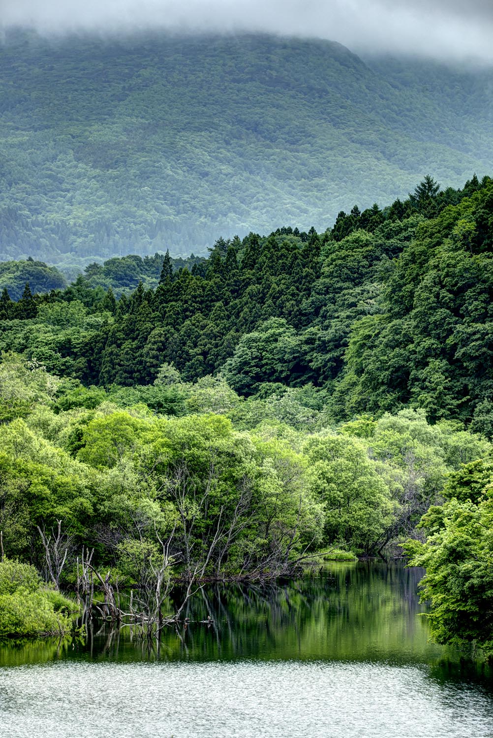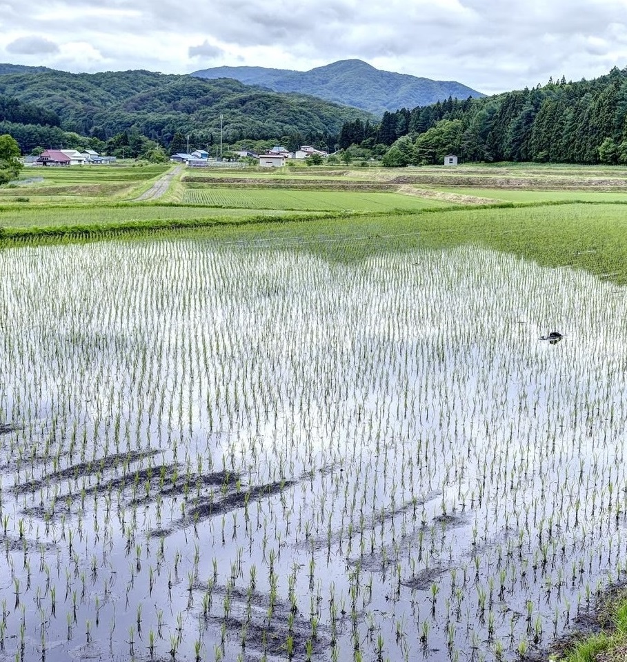 東京ドーム三つ分という広さの田んぼに張られた水が、周囲を取り囲む山々を鏡のように映し出す。そこに、青々とした苗が行儀よく並んでいる。