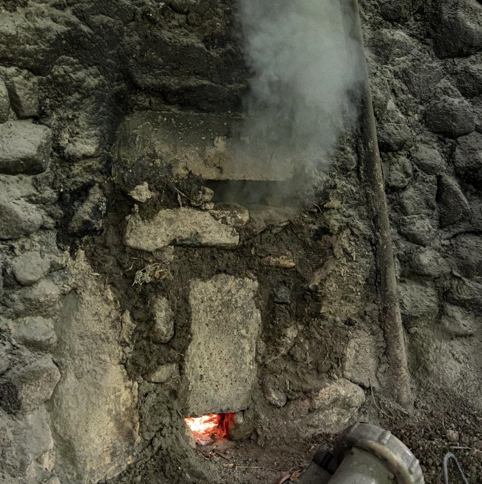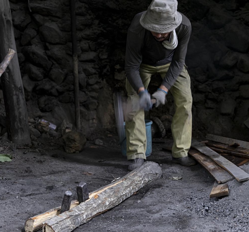 「師匠の時代、炭焼きを行うのは冬だけでした。また、窯は木を伐り出す山に造っていたので、伐り出す木がなくなれば、その窯の役目は終わり。そのため、それほど丁寧につくる必要がなかったんです。しかし、今は据え置きの窯を繰り返し使うため、耐久性が重要です。『熱する・冷やす』を繰り返すうちに天井が開いてきてしまうので、何度も補強していますね。ただ、時代が変わっても欠かせないのが水。窯の粘土を練ったり、スバイに水をぶったり(撒いたり)、万が一の時には消火します。だから、炭焼き窯は沢のそばにつくるんです」