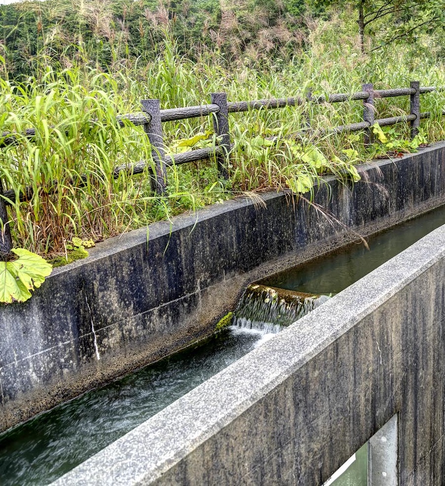 源流につながる魚道。側面の観察窓を覗くと力強く泳ぐアユやヤマメの姿が見えた