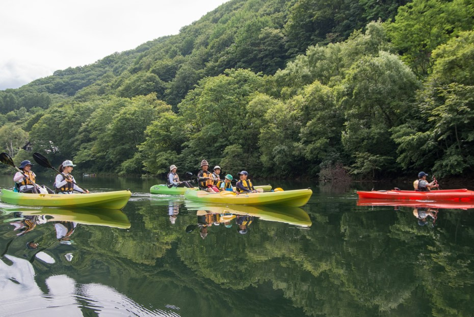 ツアーの舞台はみなかみ町の源流域、藤原湖や奈良俣湖、洞元湖、奈良俣湖とその周辺だ。参加者が鳥好きなら野鳥を探したり、魚に興味があれば魚が居そうな淵を箱メガネでのぞいたり。その都度ツアーの内容を変えられるのは、齋藤さんの知識や経験に加えて、自然が濃いからこそ、「川をのぞくとイワナやカジカ、木にはヤマセミ、空にはクマタカ。カヌーの上からクマを見かけることもありますね」と微笑んだ。