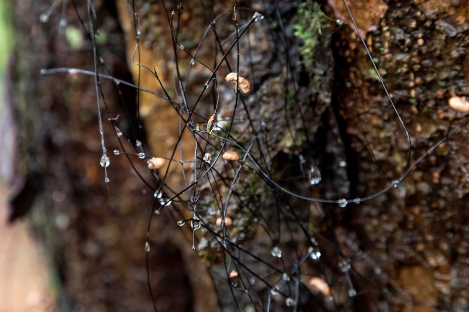「ヤマウバノカミノケといって、キノコの菌糸が束になったものです。前にアメリカ人の小学生の子に山姥の髪の毛という言葉の意味を説明したら、怖がってしまいました。あれ? ここ、見てください。ヤマンバノカミノケに子実体ができていますね。ほら、この小さい茶色い物体です。子実体はいわゆるキノコと呼ばれる部分ですよ。これは珍しいな。私は2回目ですが、こんなに多いのは初めてです」