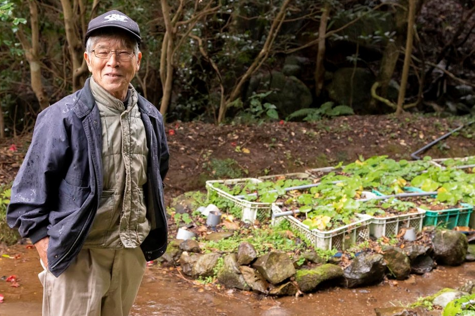 山の奥でトラックを降りた貞方さんは、80歳だとは思えないほど軽やかな足取りで、ぬかるんだ山の中を歩いていく。水音が聞こえてくると、木々の向こうにワサビ田が現れた。