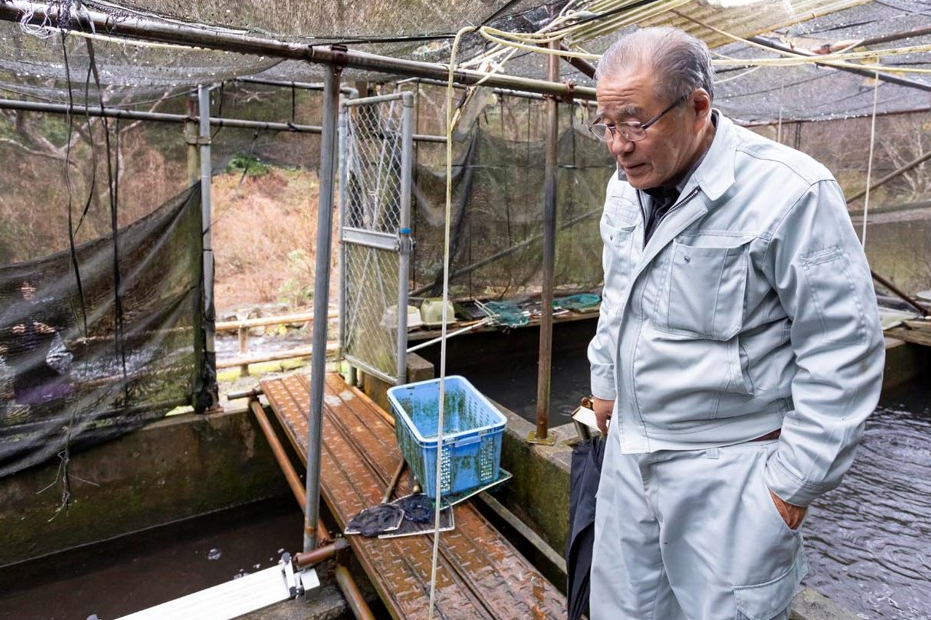 60歳からヤマメの養殖にチャレンジした七種徹さん。毎朝のエサやりが日課だという。