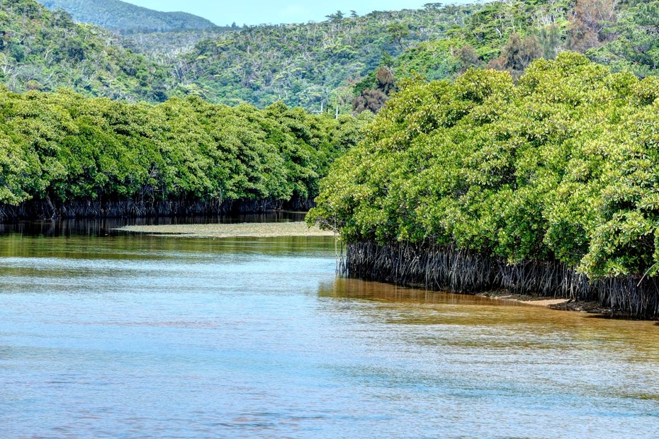 やんばる国立公園にはマングローブ林も含まれる。この写真は慶佐次湾の東村ふれあいヒルギ公園。