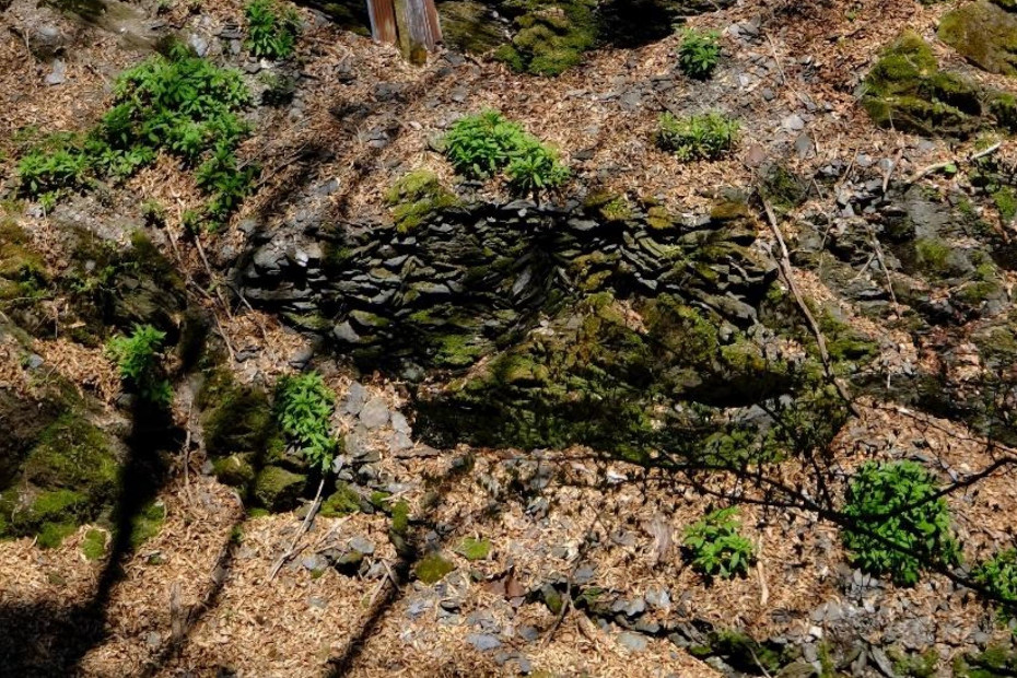 わさび田上部の急峻な枯れ谷に今も残る石積み。わさび田への土砂流入を防ぐため、端を安定させるかつての造作の名残。年月を経た今もなお、通気性、浸透性ともに機能して谷を安定させている (NPO法人地球守提供)