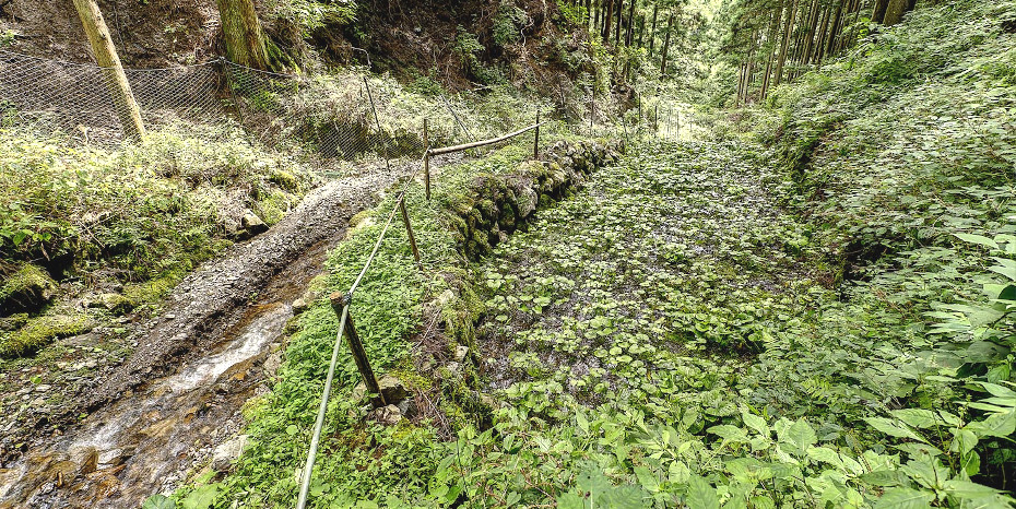 「山道や登山道をつくる際、最近は水を道の脇で浸透させるという視点がありません。道を流れ落ちる水を、単に横断溝によって集めてそれを斜面下部に流してしまうことが多く見られます。しかし、実はこれが谷筋を泥づまりさせてしまいます。その影響は『通気浸透水脈』を介して流域上部にまで影響してしまうのです。昔の人は、水が浸透して初めて大地が健全に安定することを知っていました。そのため、源流の暮らしでは暮らしの造作のすべてが山の涵養力を高めることにつなげられ、それが治水、治山、利水にもつながっていたのです」