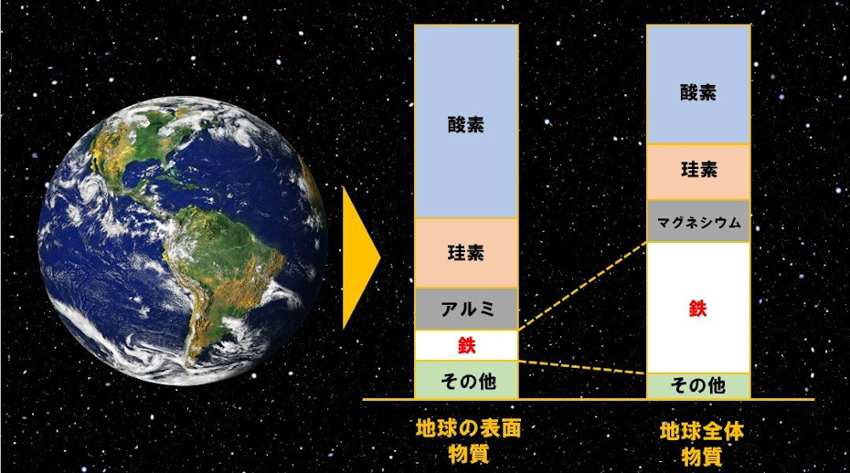 地球の表面だけで見ると酸素が最も多いが、地球全体で見ると鉄が最も多く3分の1を占める。