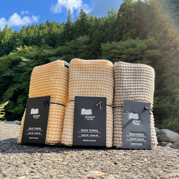 今、根羽村が取り組んでいるのが、スギの間伐材から作る「木の布プロジェクト」。 徳島県上勝町などと提携し、「KINOF」ブランドとしてタオルなどの製造・販売を進めている。
