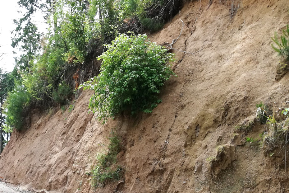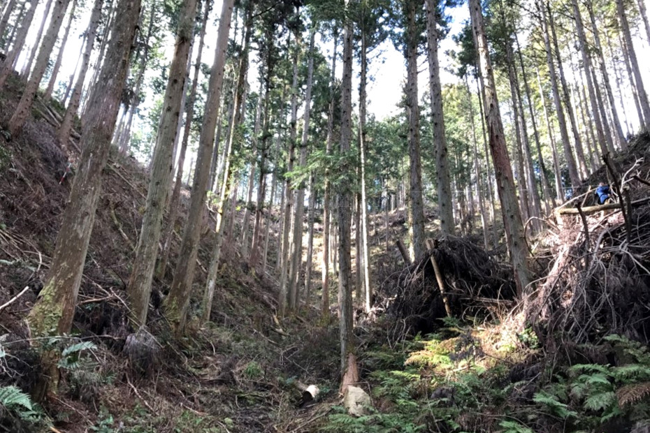 0字谷と呼ばれるすり鉢状の地形や急傾斜地は、表層崩壊が起こりやすい。そのためしっかり間伐して下草を茂らせ、さまざまな高さの木が育つようにする必要がある。