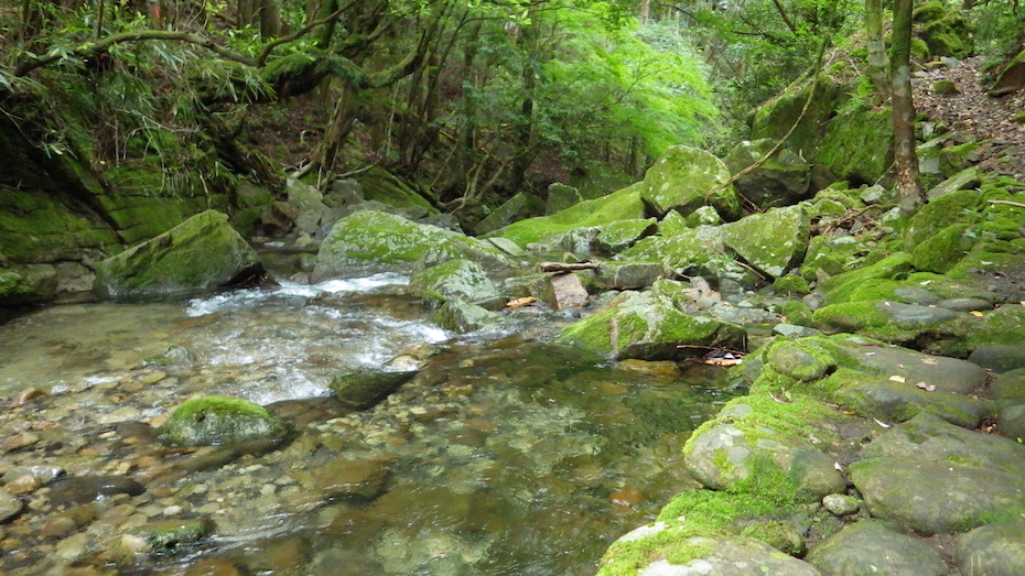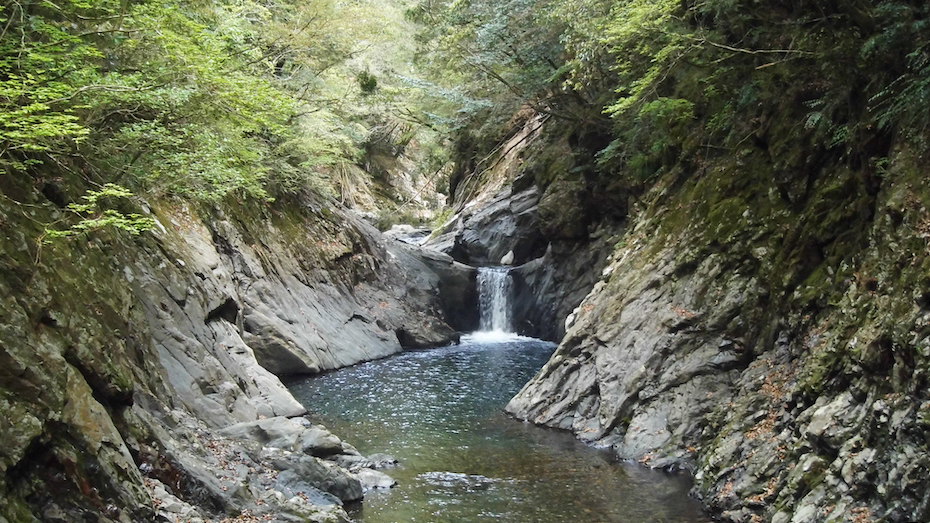 深い原生林に覆われている百間山渓谷の様子。約3kmに渡って大小の滝が連なる。