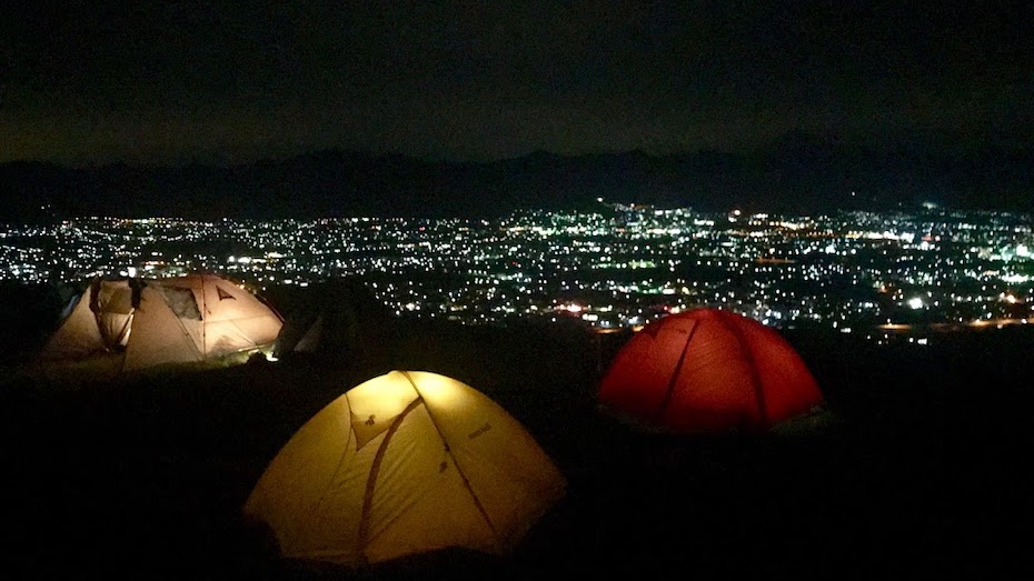 街の明かりを楽しみながら、自然に触れる大切さを考える(「天空のはたけ」でのキャンプの様子)。