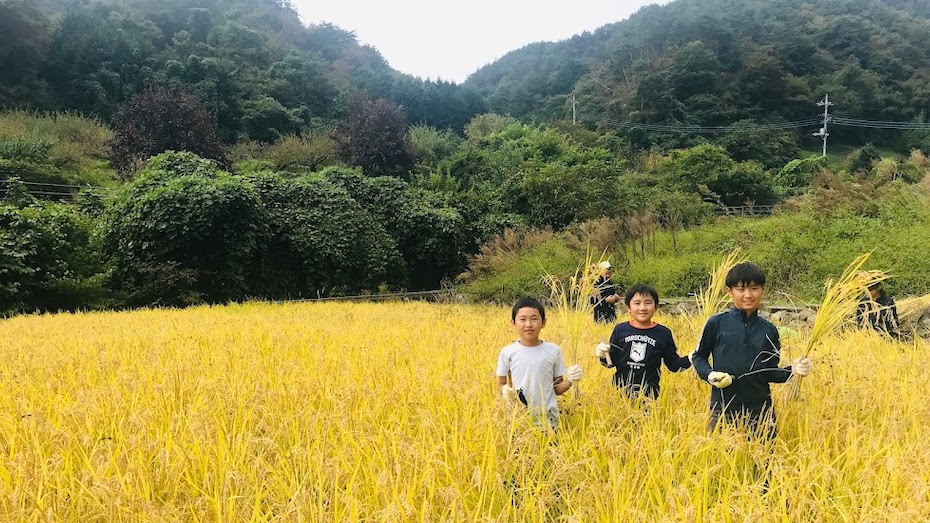 山梨県山梨市「水口のたんぼ」にて。春の田植え、秋の収穫を小学生とともにおこなう「地球元気村」のプロジェクト。自然の中では子どもから学ぶことは多い。