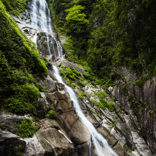 その濃密な緑の中を分入るように源流の水が流れる。その深い森が突然途切れ、水の流れは岩肌を滑り降り、滝となる。落差105mを滑り降りる間に水は絹糸の束のようにも、霧のようにも形を変え、深い藍色の滝壺へと吸い込まれていく──。大台ヶ原を水源とする東の川源流のかくれ滝だ。東の川の源流域には滝めぐりができるほど、美しい滝がいくつもあり、観光名所になっている。