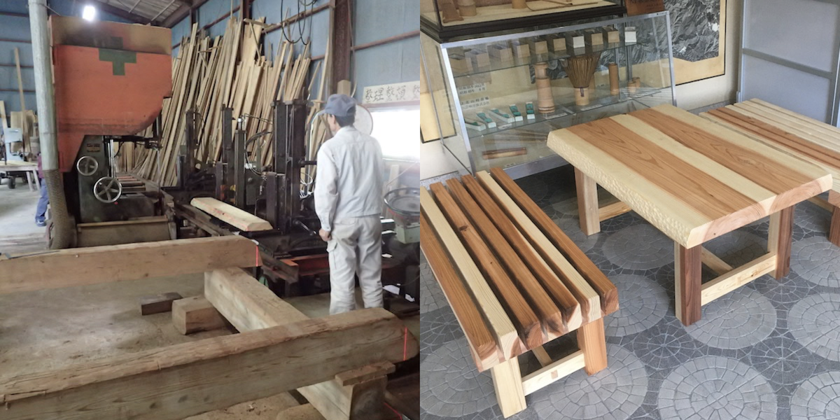 上北山村の製材所(左)。地域材を活用し木製品を作り、村内各所に設置している(右)。