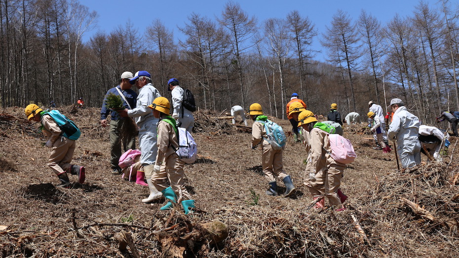 「村では60年以上前から毎年5月に植樹祭を行っており、村内の二つの小学校の緑の少年団も参加しています。最近はカラマツだけでなく、広葉樹なども植樹しています。また、村内の小学校では木育授業を実施しており、今年の5月には二つの小学校の3年生がカラマツの種蒔きを行いました。村内唯一の川上中学校には学校林があり、下草刈りなど、森林保全を体験する授業が行われています」