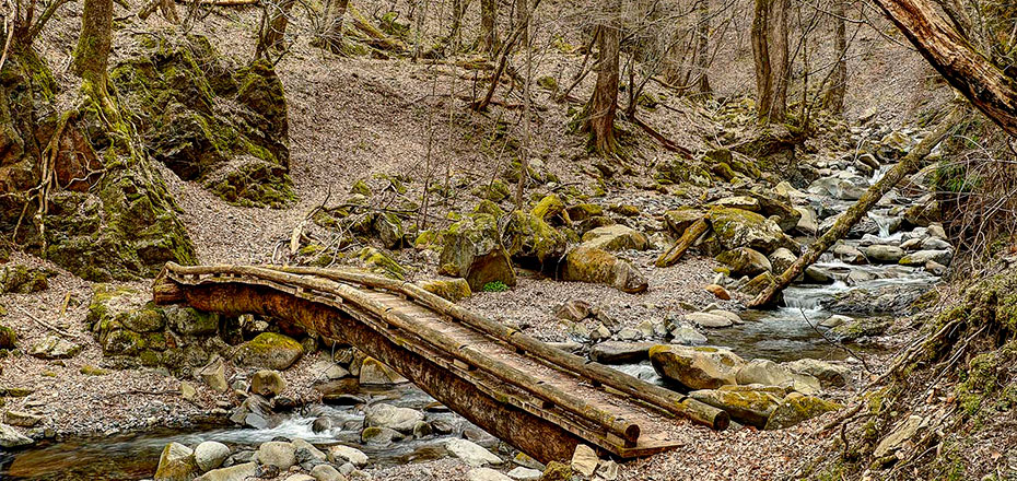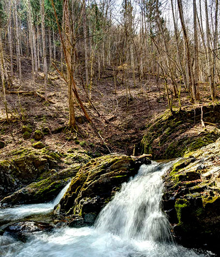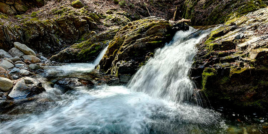お二人の案内で、さっそく源流探検がスタート。まだ新芽も出ていない冬木立の隙間を縫うように続く道を、木の根や点在する石に足を取られないよう気を配りながら渓谷の小路を進む。アップダウンの川沿い路をしばらく歩くと、清流の音が聞こえて来た。木々の間から足元を覗き込むと、澄んだ水の流れ、小菅川だ。