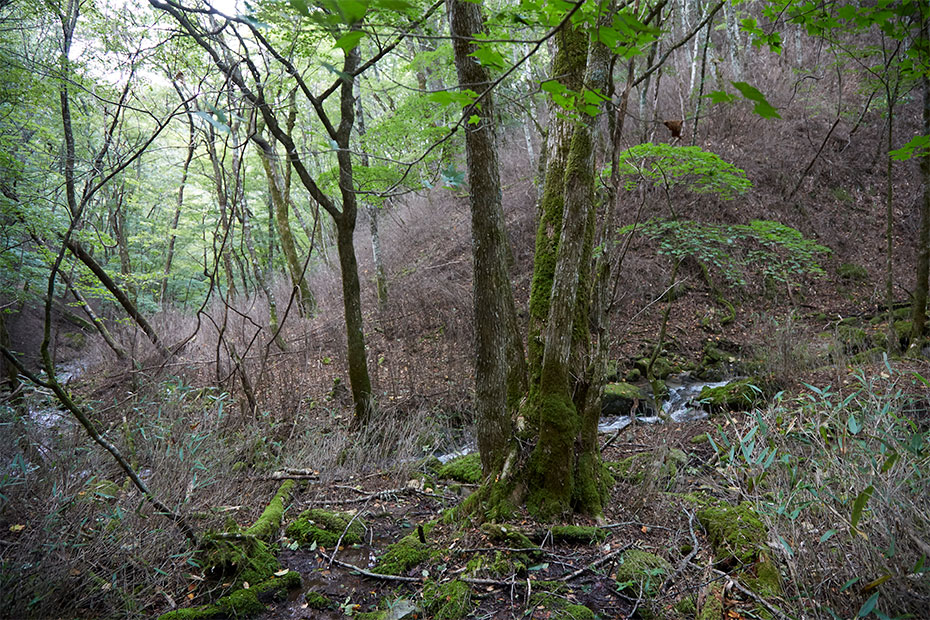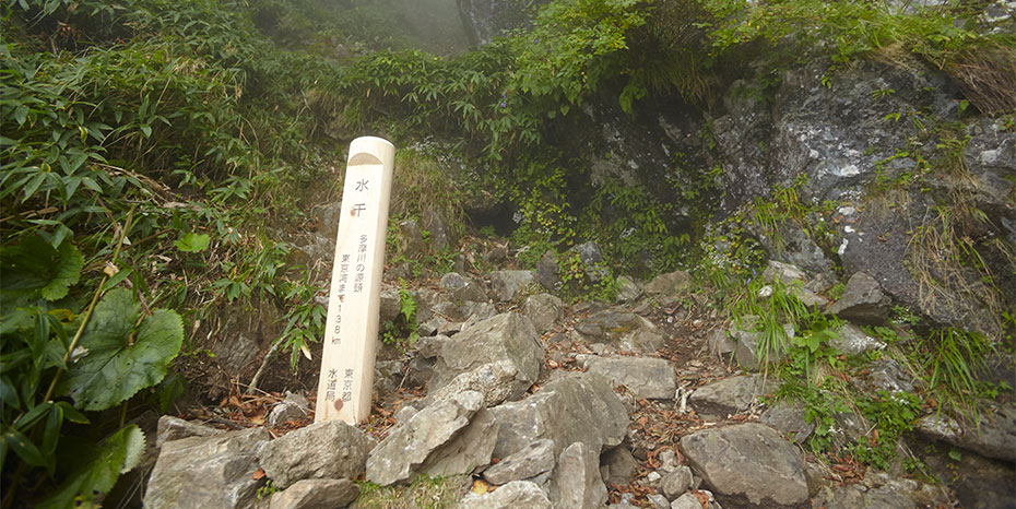 前日までの雨の影響かジワリと染み出したしずくがポタリと垂れた。多摩川の最初の一滴だ。この水は再び地下へ染み込み、この下の水場という場所で再び沢として地上に現れるのだという。その水はやがて多摩川へそそぎ、138km先の東京湾へたどり着くのだ。