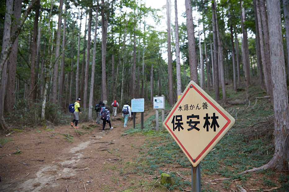 午前9時、登山開始。鬱蒼とした森に入ると、爽やかな香りに包まれた。歩き慣れた小菅村の森のふわりと柔らかい香りとは少し違う、キリッとした香り。そう言うと、青柳さんが「木の種類が違うからかもしれませんね。いつもの小菅村の森はスギやヒノキが大半ですが、ここはカラマツが多いんですよ」と教えてくれた。
