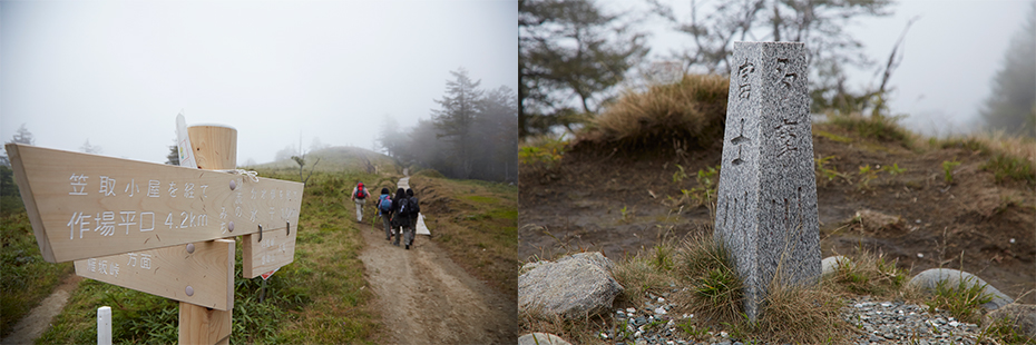平坦だった道が細くなり、傾斜がきつくなっていくにつれて、汗を拭く回数も増えていく。出発から1時間で、長めの休憩ポイントである笠取小屋に到着した。作場平口の標高1,310mに対し、笠取小屋は標高1,776mとあって、汗が引くと寒い。アウトドア用のレインウエアを羽織って再び出発した。