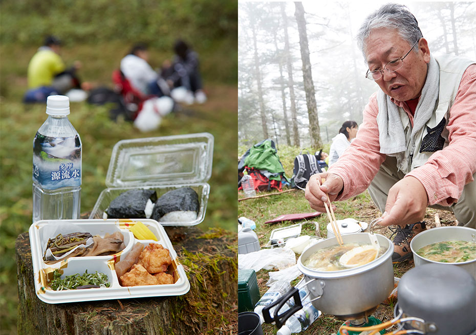 登山の楽しみの一つはやはり食事。小菅村の食材で作ってもらったお弁当に加えて、村長お手製のお味噌汁で、冷えた体がしっかり温まった。
