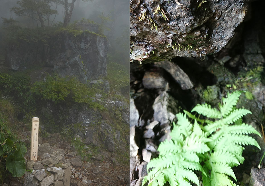 やっと辿り着いた水干。ここから最初の1滴が染み出し、水の旅が始まる。岩には「水神社」の石碑が建てられ、ここが特別な場所であることを示している