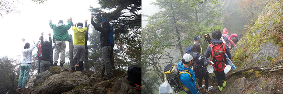 霧の中、根や岩を避けながらやっと山頂へたどり着き、全員で喜びを分かち合う。すでに太ももの筋肉は震えていたが、急斜面を降りて無事に下山。