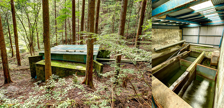 川と言うには細く、沢にしては太い水の流れ。その流れをさかのぼるように林の中を歩くと、高く積まれたコンクリートの土台を青いトタン板でぐるりと囲んだ小屋が見えてきた。