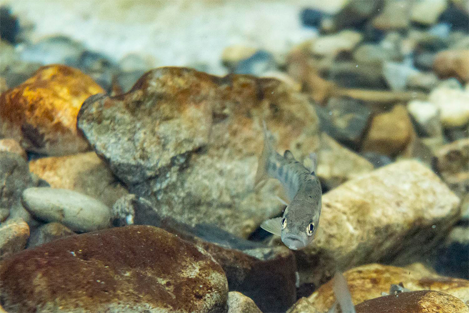 アップダウンの激しい道を、広瀬さんはひょいひょいと歩いていく。必死について行くと、川原に出た。4月にこのポイントを訪れた時に比べて、暗い気がする。それもそのはず、4月には冬枯れだった木々の枝には青々とした葉が、太陽光を遮っていた。4月に9℃だった水温は12.7℃になっている。