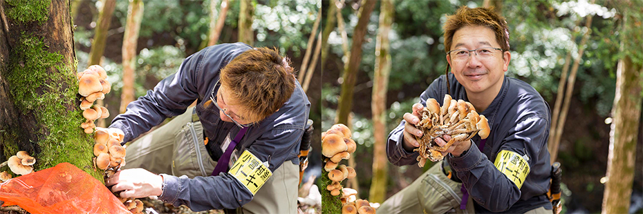 「栗の木の根元に固まって生えるクリタケです。川を見下ろす斜面なので日当たりがよく、湿度もあるので、生えやすいのでしょう。クリタケの特徴は、カサの中心の色が濃くて外側が薄いこと、縁にささくれがあること、柄はカサに近い方が白く、根に近い方が濃いことなどですね。クセがなく、歯ごたえがあって人気です。鍋に入れると美味しいんですよ」