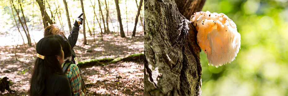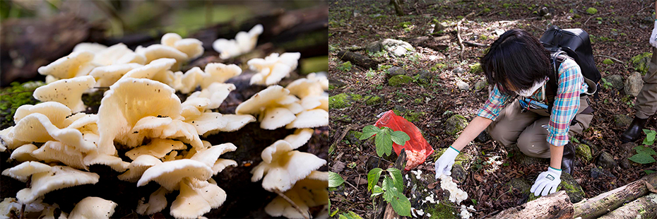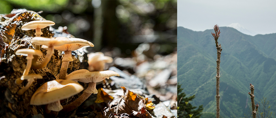 「小菅村できのこが出始めるのは、8月のお盆過ぎ。川沿いの渓畔林では9月頃から出始め、10月頃に盛りを迎えます。渓畔林にできるきのこのほとんどは、倒木に生えるタイプ。それ以外の場所では、木の根元や地面から生えるタイプが多いですね。こうしたきのこは、地面や地中の動物の死骸から栄養をもらっているんです」