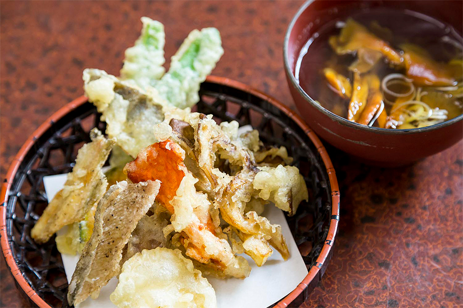 山を下りると、広瀬さんが経営する廣瀬屋旅館に向かった。お目当ては、ランチメニューの天ぷら定食。この時期は、広瀬さんが自ら山で採って来たきのこが食べられるのだ。