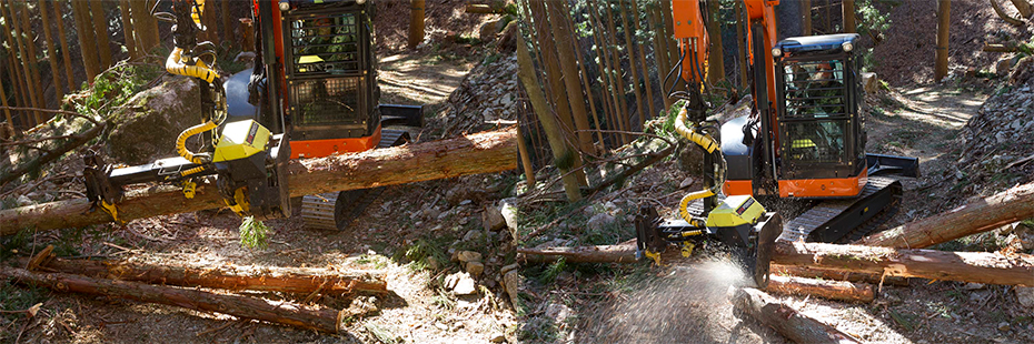 さっきまで行なっていた作業を見せてもらうことにした。磯貝さんが扱っている重機は、伐倒造林機械と言われる高性能林業機械だ。アームにはチェーンソーと円形のカッターが装着されている。そのため、この1台で「立木を伐り倒す」「枝を払う」「設定した長さに切る」「丸太を集積する」と言う作業を行うことができるそうだ。