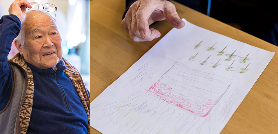 磯貝さんたちが伐っていた木が植えられた50年前に林業に携わり、苗木を植えていた人がいる。以前、小菅村の水路について話をしてくれた、青柳一男さんだ。現在85歳の青柳さんは、桧の苗木を植え方について、絵を描いて説明してくれた。