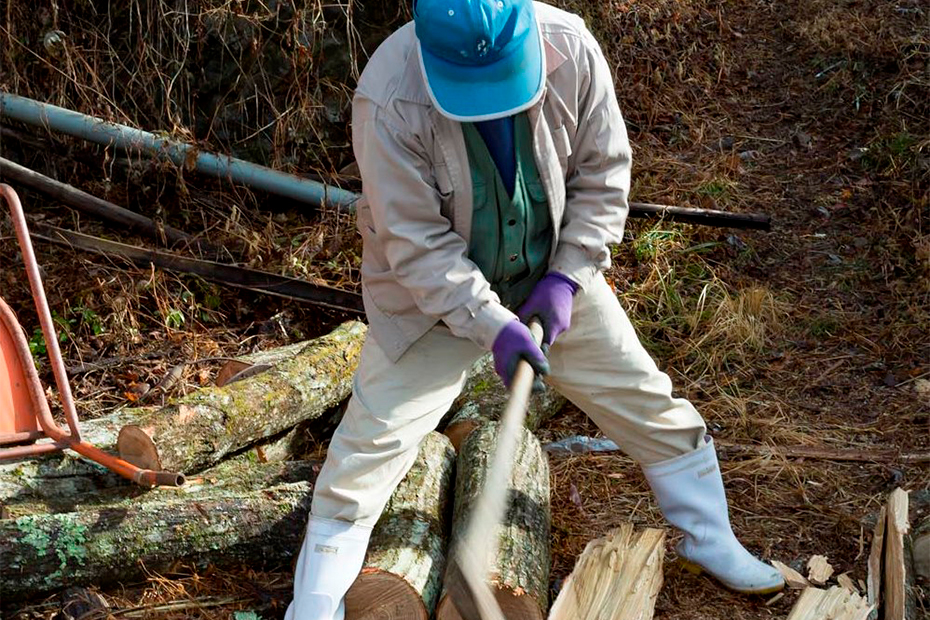 今回使うのはナラの木とクリの木だ。山から切ってきた木を1mほどの長さに玉切ってから、さらにヨキで薪割りして使う。亀井さんは自在にヨキを操り、硬いクリの木をパカーン、パカーンとリズミカルに切り分けていく。