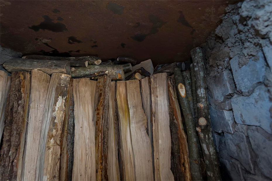 ここでも隙間ができないよう、短くて立てかけられない薪や細い枝をパズルのように組み合わせ、隙間なく並べていく。伐った木を余すことなく使うのだ。入り口付近には燃えやすい木や燃えてもいい木、さらには木っ端も総動員して、「これ以上、入らない!」というところまで隙間なく並べた。