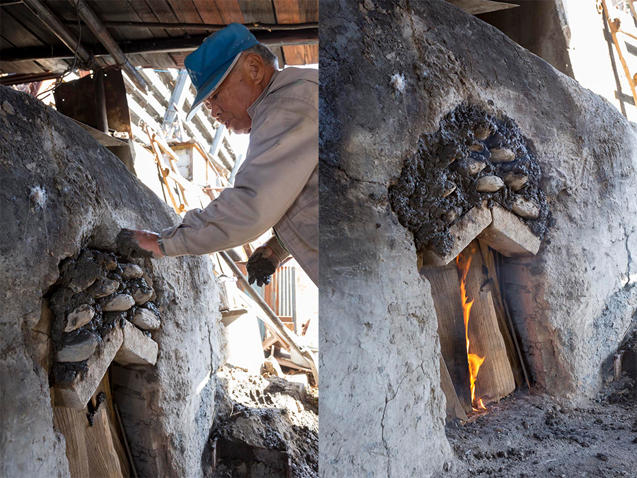 窯に薪をぎっしり詰め込んだら、レンガ・石・粘土を隙間なく重ねて蓋をする。ここで使う粘土は小菅の村の土を炭焼きのたびに繰り返し使う。入り口の上半分がふさがったら、窯の木に火をつける。