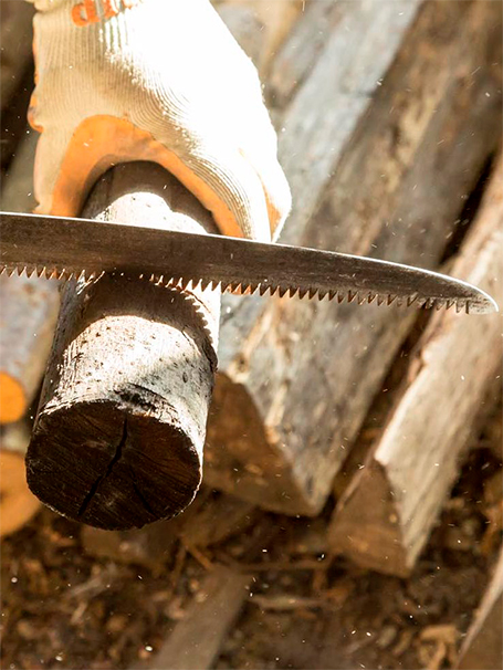 崩れて小さくなった木炭もバーベキューに使ったりと無駄にはしない。しかし、木炭中には根元が炭化しきらなかったものもある。しっかり炭になっていないものを燃やすと煙が出てしまうので、のこぎりで切り落とす。