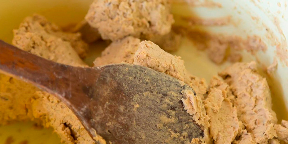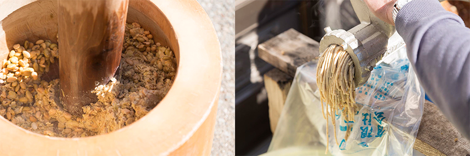 軟らかく煮た大豆を杵と臼ですり潰すのが昔ながらのやり方だ。現在は、挽肉機を使って肉をミンチ状にするという方法もある。