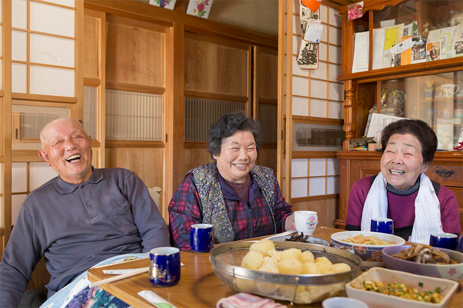 左から民宿・山水館を営む舩木幸一さん・長子さんご夫妻と、家味噌作りの手伝いに駆けつけて来てくれた、ご近所に住むお友達の青柳ツヤさん。